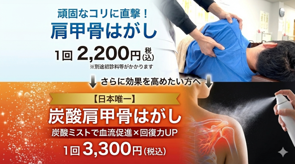 プラス1,100円で炭酸スプレーを使った炭酸肩甲骨はがしにグレードアップできます。